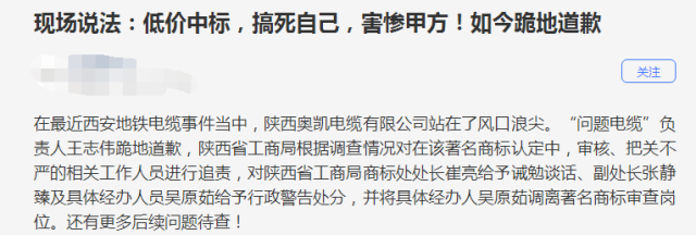 3月20日晚“西安发布”发布了一段对奥凯公司法人代表王志伟的采访视频,镜头里的王志伟浑身颤抖,面对镜头,王志伟承认了奥凯公司以次充好、供应不合格电缆的行为,并向全市人民悔罪、道歉。