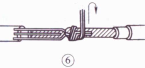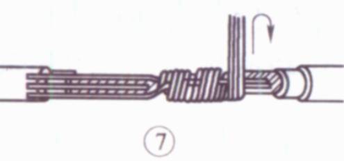 7.把余下的3根芯线按步骤⑤ 方法缠绕至第2圈时,把前4根芯线在根部分别切断,并钳平;接着把3根芯线缠足3圈,然后剪去余端,钳平切口不留毛刺。