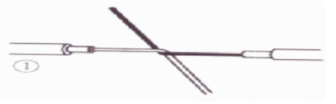 将两根双芯线线头剖削成图示中的形式。连接时,将两根待连接的线头中颜色一致的芯线按小截面直线连接方式连接。用相同的方法将另一颜色的芯线连接在一起。